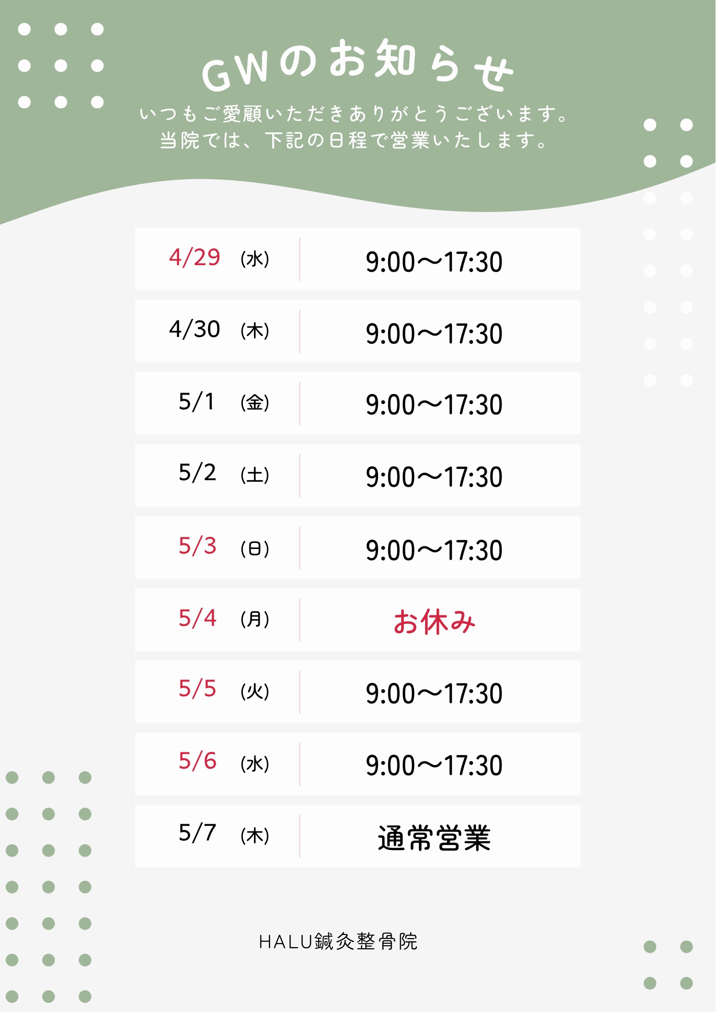 【営業時間変更とゴールデンウィークの営業日のお知らせ】